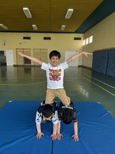 Im Wahlpflichkurs Akrobatik lernen die Schülerinnen und Schüler grundlegende Turn- und Bewegungselemente wie Vorwärtsrollen, Radschläge und erste Pyramiden. Dabei schulen sie ihr Gleichgewicht und Körpergefühl. Außerdem lernen die Schülerinnen und Schüler das gegenseitige Helfen und Sichern sowie einander zu vertrauen.