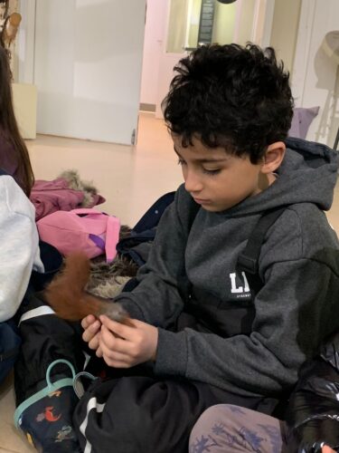 Zunächst haben wir uns im Ausstellungsraum des Dünenhauses mit dem Eichhörnchen beschäftigt. Da wir uns in der Schule bereits intensiv vorbereitet hatten, wussten die Kinder schon eine Menge zu dem Thema. Das präparierte Eichhörnchen wurde von vielen Kindern genauestens betrachtet und den Körperteilen konnten die richtigen Fachbegriffe zugeordnet werden. Zum Glück durften Schädelknochen in einer kleinen Schachtel und ein Eichhörnchenschwanz in die Hände genommen und von Kind zu Kind weitergereicht werden. Anschließend machte ein Fühlsäckchen die Runde. Den Kindern war schnell klar, dass es sich um die Nahrung des Eichhörnchens handelt, und die „Geheimnisse“ konnten gelüftet werden. Im Freien konnten die Kinder dann anhand einer Weitsprungleiste mit Tierbildern erkennen, wie weit sie springen können. Das Eichhörnchen erreichte niemand, aber wir hatten viele Mäuse unter uns. Dann galt es, Erdnüsse von Löffel zu Löffel weiterzureichen – mühsam ernährt sich eben das Eichhörnchen. Danach war Zeit für Sarahs und Olivers Bescherung. Die haben sie sich mit ihrem Einsatz wirklich verdient. Abschließend gab es noch ein kleines Picknick und dann mussten wir auch schon wieder zurück zur Schule. Wir freuen uns auf viele weitere Abenteuer in der Boberger Düne im kommenden Jahr.