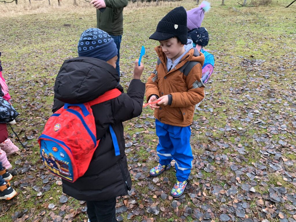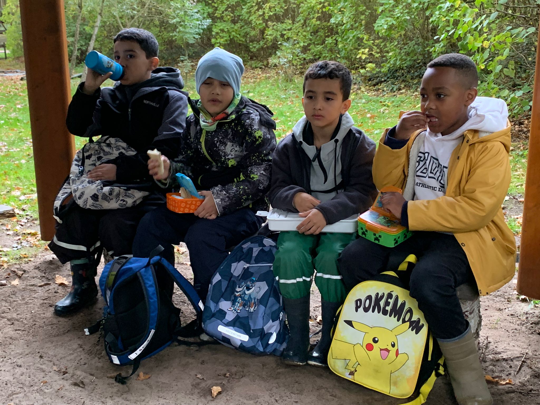 Am Donnerstag, 16. Oktober 2025, durften wir zum ersten Mal unsere Gummistiefel, Regenhosen und Rucksäcke in Richtung Boberger Düne ausführen. Nach der Busfahrt und einer kleinen Wanderung haben wir am Ziel ein perfektes, überdachtes Picknickplätzchen entdeckt und auch gleich genutzt. Essen ist immer gut! Frisch gestärkt ging es dann ins benachbarte Dünenhaus. Nach der gespannten und konzentrierten Stille zu Beginn und einer kurzen Vorstellungsrunde waren die Kinder schier überwältigt, als es in die Ausstellung ging. Für viele war es im ersten Augenblick eine Art Abenteuerspielplatz, sodass gleich an den Regeln für einen Museums- bzw. Ausstellungsbesuch gearbeitet werden konnte. Leider war unser Material nicht rechtzeitig eingetroffen und so haben wir den Rest des Vormittags mit einer ersten Walderkundung verbracht. Wir haben gelernt, wie ein Naturforscher durch den Wald zu schleichen, zu beobachten und bei Gefahr zu flüchten. Die Erkenntnis des Tages war allerdings: Müll gehört nicht in die Natur.